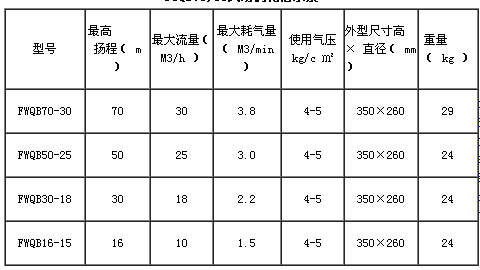 - 風(fēng)動(dòng)潛水泵動(dòng)力部分是根據(jù)汽輪機(jī)沖擊葉輪原理,F(xiàn)WQB70-30風(fēng)動(dòng)渦輪潛水泵具有優(yōu)良的空氣動(dòng)力特性,氣動(dòng)效率高。環(huán)形一體渦輪?wèn)胚x用優(yōu)質(zhì)鋁合金,硬模澆鑄并經(jīng)熱處理再機(jī)加工而成。FWQB70-30風(fēng)動(dòng)渦輪潛水泵無(wú)須象氣動(dòng)馬 達(dá)那樣需加油潤(rùn)滑及更換葉片,經(jīng)濟(jì)利用值高。FWQB70-30風(fēng)動(dòng)渦輪潛水泵泵軸上下由兩只封閉軸承支承。結(jié)構(gòu)簡(jiǎn)單,平穩(wěn)性能優(yōu)良,能確保在額定范圍內(nèi)的高轉(zhuǎn)速運(yùn)行。FWQB70-30風(fēng)動(dòng)渦輪潛水泵泵體軸封部分二只丁型骨架橡膠密封圈,利用水氣壓使封圈內(nèi)漲,增加密封效果。渦輪下端有聚氨酯防塵圈,保證了軸承部分的清潔。排氣部分采用有孔網(wǎng)板壓制而成,中置微孔泡沫材料,消音效果顯著,大力改善了井下降噪的工況條件。該泵是一種以壓縮空氣為介質(zhì),通過(guò)噴管進(jìn)入渦輪旋轉(zhuǎn)作功,泵軸隨之高速回轉(zhuǎn)帶動(dòng)泵葉輪排水。動(dòng)力部分是根據(jù)汽輪機(jī)沖擊式葉輪原理,具有優(yōu)良的空氣動(dòng)力特性,氣動(dòng)效率高。環(huán)形一體渦輪?wèn)胚x用優(yōu)質(zhì)的鋁合金,硬模澆濤并經(jīng)熱處理再機(jī)加工而成。無(wú)須象氣動(dòng)馬達(dá)那樣需加油潤(rùn)滑及更換維修葉片,經(jīng)濟(jì)利用值一步到位。風(fēng)動(dòng)渦輪潛水泵風(fēng)動(dòng)渦輪潛水泵是一種不用電,用壓縮空氣作為動(dòng)力的潛水泵,不受電源、潮濕等條件限制,特別是需要防爆的場(chǎng)所有著電動(dòng)潛水泵不可替代的安全性和可靠性。風(fēng)動(dòng)渦輪潛水泵是一種高效率,高揚(yáng)程的新型排水工具,風(fēng)動(dòng)渦輪潛水泵主要適用于礦山開(kāi)拓,掘井巷道和豎井井筒施工排水作業(yè)。風(fēng)動(dòng)渦輪潛水泵該型號(hào)風(fēng)動(dòng)渦輪潛水泵是我公司多位專家、高工經(jīng)研究分析,揚(yáng)長(zhǎng)避短,在原QYQ17-70型風(fēng)泵基礎(chǔ)上,保持原產(chǎn)品的傳統(tǒng)特點(diǎn)進(jìn)行了有重大突破的改進(jìn)。風(fēng)動(dòng)渦輪潛水泵在動(dòng)力部分采用了葉片式風(fēng)動(dòng)馬達(dá),自動(dòng)離心調(diào)速等機(jī)構(gòu),能確保在額定范圍內(nèi)的高速運(yùn)轉(zhuǎn),風(fēng)動(dòng)渦輪潛水泵是礦山掘井,建井的理想排水工具。QYW系列風(fēng)動(dòng)排沙排污潛水泵總體結(jié)構(gòu)簡(jiǎn)單,裝拆及維護(hù)保養(yǎng)移動(dòng)方便,在含有瓦斯與煤塵等易燃易爆的排水作業(yè)面使用絕對(duì)安全可靠,并在排氣口配置有自主知識(shí)產(chǎn)權(quán)的系列新型低噪消聲器(發(fā)明專利號(hào):ZL200610097296.9),大大降低了噪音量,實(shí)測(cè)≤75db(A),大大改善了井下使用的工況條件。風(fēng)動(dòng)渦輪潛水泵突破了往日的設(shè)計(jì)思想,采用風(fēng)動(dòng)渦輪傳動(dòng)、壓縮空氣為動(dòng)力的新型潛水泵,克服了老式風(fēng)泵噪音大、耗風(fēng)量大、效率低的缺點(diǎn),廣泛適用于礦山的井巷開(kāi)拓、豎井井筒施工和地下峒室工程的排水施工。FWQB70-30風(fēng)動(dòng)渦輪潛水泵其特點(diǎn):1、噪音小,保持在40分貝以內(nèi);2、耗風(fēng)量少、效率高;3、風(fēng)動(dòng)渦輪潛水泵體積小、重量輕、結(jié)構(gòu)緊湊、便于移動(dòng);4、風(fēng)動(dòng)渦輪潛水泵使用壽命長(zhǎng)、易損件少、便于維修。風(fēng)動(dòng)渦輪潛水泵哪些型號(hào)風(fēng)動(dòng)潛水泵型號(hào)有BQS防爆潛水泵系列,F(xiàn)WQB風(fēng)動(dòng)渦輪潛水泵,QYW風(fēng)動(dòng)潛水泵。常見(jiàn)型號(hào)有FWQB70-30風(fēng)動(dòng)潛水泵,F(xiàn)WQB30-18風(fēng)動(dòng)潛水泵,F(xiàn)WQB50-25風(fēng)動(dòng)潛水泵, FWQB30-70風(fēng)動(dòng)潛水泵,QYW25-70風(fēng)動(dòng)潛水泵,F(xiàn)QW20-40/W,QYW17-90風(fēng)動(dòng)潛水泵,F(xiàn)QW18-30/W等一、概述 FWB35-18A型風(fēng)動(dòng)渦輪潛水泵是采用風(fēng)動(dòng)渦輪傳動(dòng),壓縮空氣為動(dòng)力的新型水泵。主要應(yīng)用于礦山井巷開(kāi)拓、豎井井筒施工、地下室工程的排水施工。此外,凡具備有壓縮空氣各種現(xiàn)場(chǎng)施工排水,均能廣泛應(yīng)用。二、風(fēng)動(dòng)渦輪潛水泵特點(diǎn)1、無(wú)級(jí)調(diào)速。只要控制節(jié)流閥開(kāi)啟程序,即控制氣體流量,就可以實(shí)現(xiàn)無(wú)級(jí)調(diào)速。2、使用可靠,經(jīng)久耐用,不受溫度及震動(dòng)的影響,安裝、操作、簡(jiǎn)單。3、設(shè)有消音裝置,噪音小,維修方便,易損件小。4、風(fēng)動(dòng)渦輪潛水泵具有較高的起動(dòng)力矩和幾乎瞬時(shí)升到全速工作的能力。5、適應(yīng)能力強(qiáng)。適應(yīng)于排放清水、濁水(泥漿、泥砂、煤渣水),重量輕。三、風(fēng)動(dòng)渦輪潛水泵技術(shù)參數(shù)1、相程5-35m(雙風(fēng)邊5-50m)2、流量8-28m3/ih3、工作風(fēng)壓3-6kgf/cm24、耗風(fēng)量3-4m3/min5、額定轉(zhuǎn)速4500r/min6、水輪直徑120mm7、進(jìn)風(fēng)膠管內(nèi)徑25min8、排水膠管內(nèi)徑50min9、噪音≤88db四、FWQB70-30風(fēng)動(dòng)渦輪潛水泵結(jié)構(gòu)與工作原理 FWB35-18A型風(fēng)動(dòng)渦輪潛水泵主要由泵殼、泵軸、渦輪、限速和消音裝置等部件組成,泵殼由泵蓋、