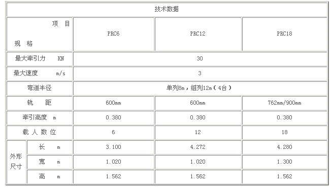 PRC平巷人車分PRC6-6/3、PRC8-6/3、PRC12-6/3和PRC18-9/3四種型號(hào),最大行駛速度為4米/秒,最大牽引力為30KN,轉(zhuǎn)彎半徑8米。