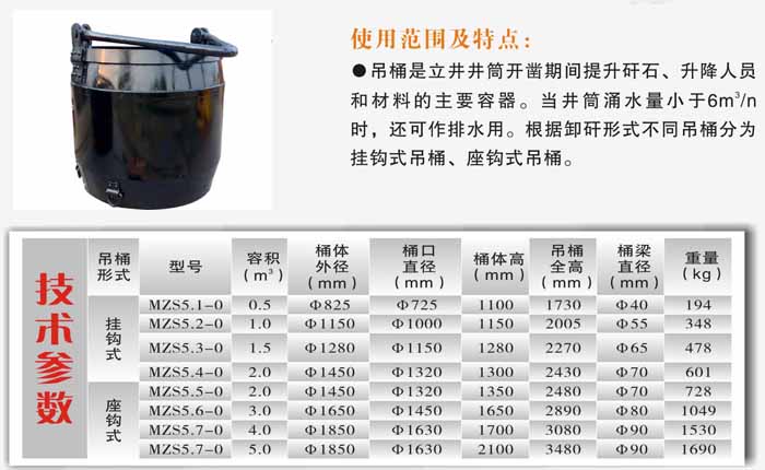 - 吊桶,根據(jù)卸矸形式不同那,可分為掛鉤式吊桶和座鉤式吊桶。而吊桶是立井井筒開(kāi)鑿期間提升矸石,升降人員和材料的主要容器。并且,當(dāng)井筒涌水量小于/h時(shí),還可作排水用。非常方便,簡(jiǎn)單易操作。使用范圍及特點(diǎn):吊桶是立井井筒開(kāi)鑿期間提升矸石、升降人員和材料的主要容器。當(dāng)井筒涌水量小于6M3/h時(shí),還可作排水用。根據(jù)卸矸形式不同吊桶分為掛。鉤式吊桶、座鉤式吊桶座鉤式吊桶的用途:吊桶是立井井筒開(kāi)鑿期間提升矸 石、升降人員和材料的主要容器。當(dāng)井筒涌水量小于6M3/h時(shí),還可作排水用。座鉤式吊桶是礦山立井施工中用于運(yùn)送混凝土的專(zhuān)用設(shè)備,它適用于煤礦、金屬礦、非金屬礦及其他立井施工需要澆注混凝土的場(chǎng)合。座鉤式吊桶特別對(duì)用凍結(jié)施工深表土層時(shí)、不能使用輸料管下料時(shí),更適合,座鉤式吊桶是煤礦鑿井期間安全生產(chǎn)必不可少的。舊式底卸式吊桶在使用過(guò)程中顯得笨拙,操作不方便,卸料不完全等缺點(diǎn)。本產(chǎn)品在原有的技術(shù)上改革創(chuàng)新,擺脫了這些缺點(diǎn),提高了輸送混凝土的速度,操作簡(jiǎn)便,在出料口的弧行板面設(shè)有橡膠板,保證了出料口部的密封性和漿液不泄露,同時(shí)也延長(zhǎng)了吊桶的使用壽命,對(duì)避免和防止在煤礦立井期間不安全的隱患發(fā)生有著十分重要的意義,因此將該項(xiàng)技術(shù)推廠(chǎng)應(yīng)用,順應(yīng)煤礦安全生產(chǎn)和發(fā)展的趨勢(shì)和需求。結(jié)構(gòu) 兩種型式的吊桶的結(jié)構(gòu)均如下圖所示,不同的是掛鉤式吊桶是平底,座鉤式吊桶如下圖右下角所示是雙層桶底結(jié)構(gòu)。另外,3m3以下型號(hào)桶梁無(wú)圖示之支撐。座鉤式吊桶輸送混凝土的優(yōu)點(diǎn)是:1、卸料快,操作簡(jiǎn)便。2、安全可靠。3混凝土的水灰比能得以充分保證。比用管道輸送的優(yōu)點(diǎn)是無(wú)離析現(xiàn)象。4、在完成一個(gè)段高的砌壁工作后,工作面清理工作量小,從而砌壁速度快。5、矸石吊桶在翻轉(zhuǎn)卸料時(shí)對(duì)吊盤(pán)沖擊大,底卸式吊桶則無(wú)此弊端,且不須在吊盤(pán)上設(shè)專(zhuān)人司摘掛鉤工作,因而能節(jié)省人時(shí)。6、能適應(yīng)各種砌壁工藝。座鉤式吊桶需要配鉤頭裝置使用,礦用吊桶是立井井筒開(kāi)鑿期間提升矸石、升降人員和材料的主要容器。座鉤式吊桶應(yīng)用要求1. 使用前應(yīng)檢查銷(xiāo)軸的螺母及開(kāi)口銷(xiāo)是否松動(dòng)損壞脫落、銷(xiāo)軸桶梁轉(zhuǎn)動(dòng)處是否銹蝕、轉(zhuǎn)動(dòng)是否靈活,有缺件及時(shí)更換。使用時(shí)各轉(zhuǎn)動(dòng)處應(yīng)加油潤(rùn)滑,避免零件之間的干磨損。2.座鉤式吊桶桶體上的四個(gè)鉤環(huán),主要供提升時(shí)穩(wěn)定、移動(dòng)及更換吊桶時(shí)操作之用。3. 桶梁掛鉤處磨損量達(dá)到下列情況時(shí),建議更換: ⑴ 容積4m³以上(含4m³)吊桶桶梁磨損量小于垂直方向設(shè)計(jì)直徑10mm時(shí);⑵ 3m³以下(含3m³)的吊桶桶梁磨損量小于垂直方向設(shè)計(jì)直徑12%時(shí)。4. 使用期間應(yīng)有專(zhuān)人對(duì)桶梁、銷(xiāo)軸、耳環(huán)、鉚釘、焊縫進(jìn)行檢查。5.座鉤式吊桶適用于自動(dòng)翻矸裝置。座鉤式吊桶的桶底是雙層桶底,桶底中間有中心圓孔,是為自動(dòng)翻矸時(shí)與鉤子配合所用,吊桶規(guī)格不同,雙層桶底中心孔幾何尺寸也不同,使用時(shí)只需參照吊桶圖樣式對(duì)自動(dòng)翻矸裝置的托架寬度與支撐高度加以修改即可。掛鉤式吊桶無(wú)雙層桶底,適用于人工掛鉤翻矸.6. 為防止桶梁砸手,應(yīng)在桶梁落腳的桶口處焊上四個(gè)桶梁支撐板塊。座鉤式吊桶保養(yǎng)、維修用戶(hù)應(yīng)定期檢查桶梁耳柄、內(nèi)外耳環(huán)板孔壁、桶梁掛鉤段圓弧、銷(xiāo)軸軸頸等處的潤(rùn)滑及磨損情況,經(jīng)常處于干摩擦狀態(tài)時(shí)會(huì)加劇磨損,當(dāng)磨損量達(dá)到第五條中的相關(guān)規(guī)定時(shí),建議更換。當(dāng)桶體壁凹凸不平嚴(yán)重、彎曲變形、銹蝕嚴(yán)重、桶壁減薄、局部焊縫開(kāi)裂,應(yīng)進(jìn)行檢修再用。貯存半年以上,使用前進(jìn)行檢查、保養(yǎng)。