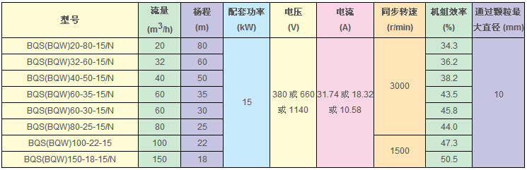 BQS(W)15KW的礦用隔爆型排污排沙潛水電泵技術(shù)參數(shù):