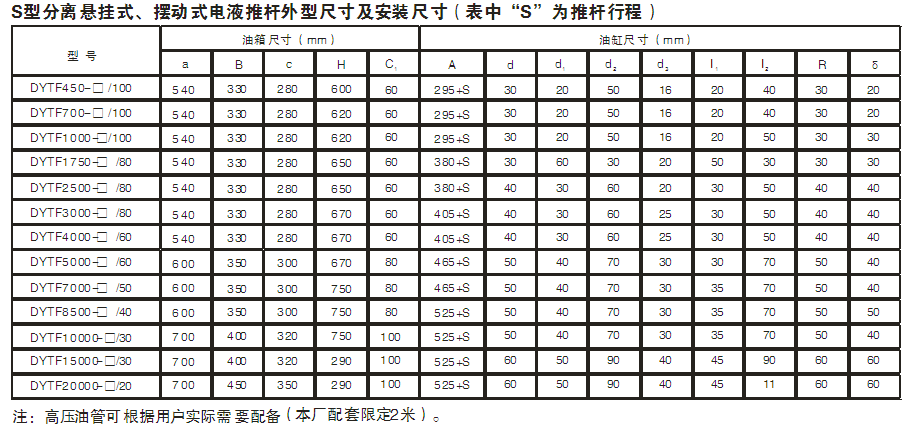 DTYF型分離式電液推桿優(yōu)點(diǎn):1.DTYF型分離式電液推桿具有過(guò)載自動(dòng)保護(hù)功能:電液推桿工作時(shí),如活塞桿所受外力超過(guò)額定的輸出力或活塞已到終點(diǎn),電機(jī)仍在轉(zhuǎn)動(dòng),這時(shí)油路中油壓增高到調(diào)定的壓力,溢流閥迅速而準(zhǔn)確地溢流,實(shí)現(xiàn)過(guò)載自動(dòng)保護(hù)。電機(jī)雖在轉(zhuǎn)動(dòng),但絕不會(huì)燒毀。自鎖功能:電液推桿的油路集成塊中設(shè)計(jì)了壓力自鎖機(jī)構(gòu),電機(jī)停止轉(zhuǎn)動(dòng),活塞桿立即停留在一定的位置上,壓力油處于保壓狀態(tài)。無(wú)級(jí)調(diào)節(jié):可根據(jù)用戶(hù)要求,在額定的速度、輸出力和行程范圍內(nèi)進(jìn)行無(wú)級(jí)調(diào)節(jié)。DTYF型分離式電液推桿在冶金、礦山、煤炭、電力、機(jī)械、糧食、水泥、化工、水利、運(yùn)輸?shù)刃袠I(yè),是不可缺少的通用動(dòng)力源,DTYF型分離式電液推桿概述:DYT、DYTB系列電液推桿可做往復(fù)推桿直線(xiàn)或往復(fù)旋轉(zhuǎn)一定角度的運(yùn)動(dòng),適用于上升、下降或夾緊工作物的場(chǎng)所,也適用于與遠(yuǎn)距離及高空危險(xiǎn)地區(qū),廣泛適用于冶金、礦山、煤炭、電力、機(jī)械、水泥、化工、水利、運(yùn)輸?shù)炔块T(mén)。電液推桿的工作條件:推桿應(yīng)在不含腐蝕性、不易燃易爆的介質(zhì)環(huán)境中使用。如遇有上述情況,推桿應(yīng)注明屬特殊規(guī)格。工作環(huán)境溫度:-35℃~60℃相對(duì)濕度:<95%無(wú)強(qiáng)烈震動(dòng)。滿(mǎn)負(fù)荷工作時(shí),不應(yīng)超出推拉力。海拔高度符合GB755規(guī)定。電液推桿訂貨須知DTYF型分離式電液推桿主要是由推桿的型式、電機(jī)的防護(hù)等級(jí)、額定輸出力、行程、額定速度和使用角度等六大基本要素組成,DTYF型分離式電液推桿還可根據(jù)擁護(hù)特殊要求,配套三種調(diào)節(jié)功能,即:速度調(diào)節(jié)推、拉力調(diào)節(jié),行程調(diào)節(jié)(行程開(kāi)關(guān)定位)。DTYF型分離式電液推桿工作原理:1、DTYF型分離式電液推桿以電動(dòng)機(jī)為動(dòng)力源,通過(guò)電動(dòng)機(jī)正(反)向旋轉(zhuǎn),使液壓油通過(guò)雙向齒輪泵輸出壓力油,經(jīng)油路集成塊,送至工作油缸,實(shí)現(xiàn)活塞桿的往復(fù)運(yùn)動(dòng)。2、過(guò)載自動(dòng)保護(hù)功能:電液推桿工作時(shí),如活塞桿所受外力超過(guò)額定的輸出力或活塞已到終點(diǎn),電機(jī)仍在轉(zhuǎn)動(dòng),這時(shí)油路中油壓增高到調(diào)定的壓力,溢流閥迅速而準(zhǔn)確地溢流,實(shí)現(xiàn)過(guò)載自動(dòng)保護(hù)。電機(jī)雖在轉(zhuǎn)動(dòng),但絕不會(huì)燒毀。3、自鎖功能:電液推桿的油路集成塊中設(shè)計(jì)了壓力自鎖機(jī)構(gòu),電機(jī)停止轉(zhuǎn)動(dòng),活塞桿立即停留在一定的位置上,壓力油處于保壓狀態(tài)。4、可根據(jù)用戶(hù)要求,在額定的速度范圍內(nèi)進(jìn)行無(wú)級(jí)調(diào)節(jié)速度。5、可根據(jù)用戶(hù)要求,在額定的輸出力范圍內(nèi)進(jìn)行無(wú)級(jí)調(diào)節(jié)推、拉力。6、可根據(jù)用戶(hù)要求,在額定的行程范圍內(nèi)進(jìn)行無(wú)級(jí)調(diào)節(jié)行程。DTYF型分離式電液推桿具有以下優(yōu)點(diǎn):1、安裝方便、維護(hù)簡(jiǎn)單。在安裝、使用過(guò)程中,24小時(shí)技術(shù)指導(dǎo)電話(huà).2、采用了全液壓傳動(dòng)、能有效的緩沖外來(lái)的沖擊力,運(yùn)行中動(dòng)作靈敏、平穩(wěn),行程控制精準(zhǔn),誤差不會(huì)超過(guò)0.5mm。3、安全措施好,如操作中斷電,推桿就會(huì)自動(dòng)鎖閉,避免事故的發(fā)生。4、雙向鎖設(shè)置,可在規(guī)定范圍行程內(nèi)的任意位置自行鎖閉,且保持輸出力不變。5、推拉力、速度,可按需要要求設(shè)置,驅(qū)動(dòng)力范圍及其廣泛。6、可在惡劣的環(huán)境下使用,使用壽命長(zhǎng),內(nèi)部不會(huì)銹蝕、不會(huì)進(jìn)水、體積小、不滲油。DTYF型分離式電液推桿安裝使用時(shí)注意事項(xiàng)1.DTYF型分離式電液推桿安裝要有足夠的空間,環(huán)境溫度10-60度之間(高溫環(huán)境要特別訂貨)。2.用戶(hù)可根據(jù)控制需要配置行程開(kāi)關(guān)。3.電動(dòng)液壓推桿安裝前先平放在地上,注入液壓油(牌號(hào)HM.精度等級(jí)46-68)油位在觀(guān)察口下緣,分體推桿油面應(yīng)在離箱50mm以?xún)?nèi)。4.DYTZ、DYTP、DYTF在使用前應(yīng)旋松排氣孔的排氣螺絲2圈。5.安裝時(shí)要試開(kāi)機(jī)。a.整體推桿,接上電源即可運(yùn)行b.分體推桿,接上電源讓油缸在無(wú)負(fù)載情況下,往復(fù)動(dòng)作數(shù)次使油缸和油管中的空氣排出,在帶上負(fù)載電液推桿的維護(hù)1.為保證高壓油管的使用壽命,要用膠皮把油管固定好。2.使用液壓油要定期過(guò)濾或者更換,一年一次或根據(jù)實(shí)際工作自定周期。3.長(zhǎng)期閑置不用,仔投入使用前要對(duì)電機(jī)進(jìn)行絕緣檢查。4.簡(jiǎn)易故障排除a.剛安裝時(shí)不能動(dòng)作,查電機(jī)未運(yùn)行或油量不足。b.使用一段時(shí)間后不能動(dòng)作,拆下液控落塞,清洗液控閥閥芯,更換液壓油。使用長(zhǎng)時(shí)間后,推桿空載能夠推拉,帶負(fù)載不能攤位。更換油缸內(nèi)活塞上孔用密封件。密
